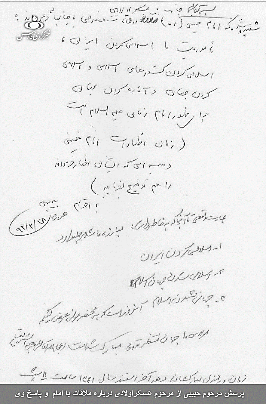 مرد آرمانهای الهی، خمینی کبیر به دنبال چنین مقصدی بود. دبیر کل حزب مؤتلفۀ اسلامی آقای محمدنبی حبیبی نوشته است: «زمانی من از مرحوم عسگراولادی خاطرهای از امام شنیدم و از ایشان خواستم این خاطره را برای من مکتوب کنند. ایشان گفتند من در اسفند سال ۱۳۴۱ و بعد از غائلۀ انجمنهای ایالتی و ولایتی که مراجع و علما در مقابل نظام شاه ایستادند در قم با امام ملاقات کردم و به امام عرض کردم شرایط خیلی سخت شده است و همۀ مبارزین را سایه به سایه تعقیب میکنند. امام در پاسخ به ایشان میگویند: آقای عسگراولادی! شما میدانید مقصود ما از این نهضت چیست؟ نهضت ما سه مرحله دارد. یک: اسلامی کردن ایران، دو: اسلامی شدن جهان اسلام و سه: جهانی شدن اسلام و آن روز است که محضر امام زمان۷ عرض میکنیم: مولای ما جهان آمادۀ قدوم مبارک شماست».